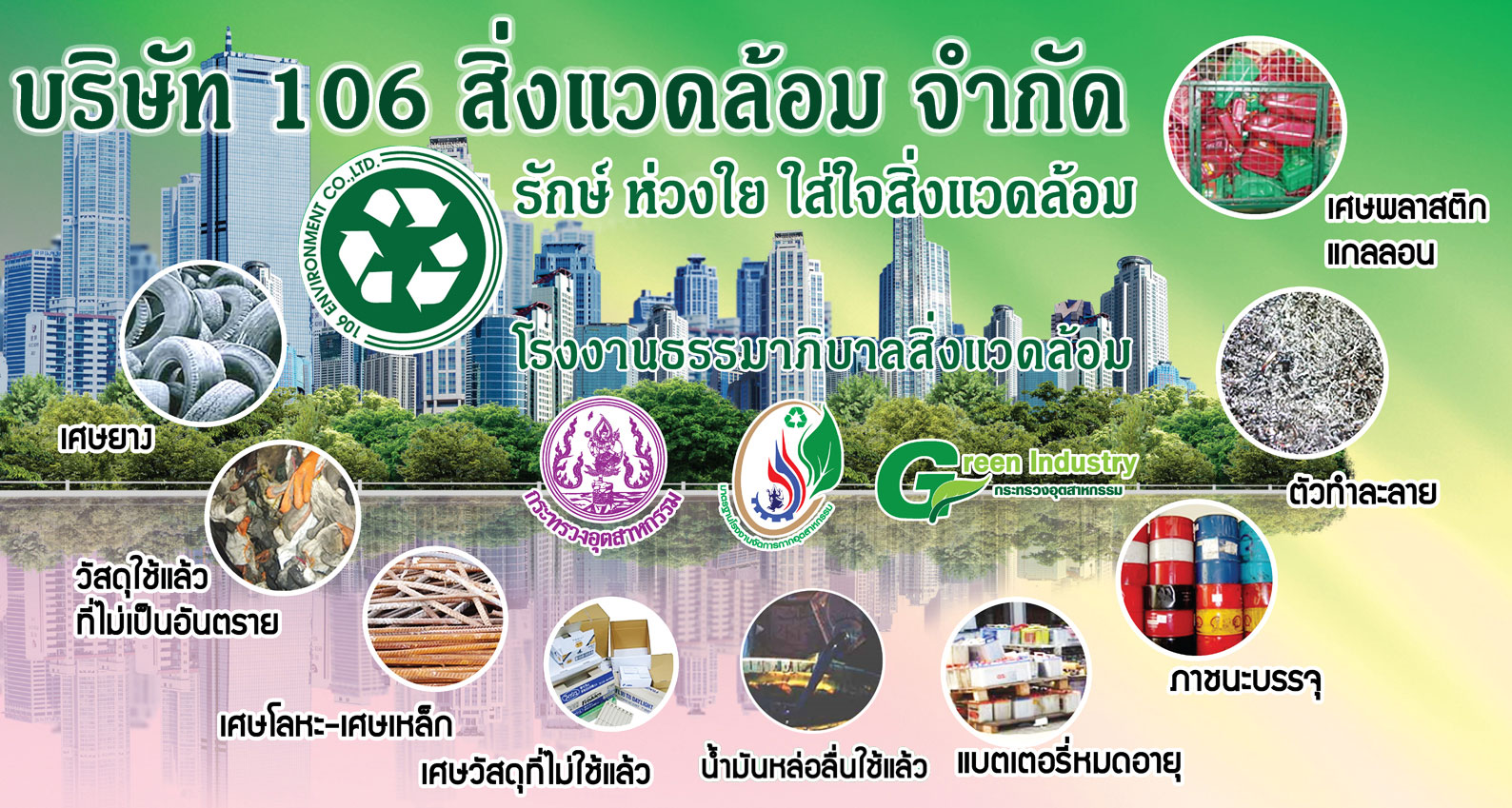 บริษัท 106 สิ่งแวดล้อม จำกัดเป็นผู้ดำเนินการ ให้บริการด้าน การกำจัดกากอุตสาหกรรม ประเภทต่างๆ เช่น น้ำมันหล่อลื่นใช้แล้ว, ตัวทำละลายใช้แล้ว, เศษเหล็ก, เศษกระดาษ, ไส้กรองน้ำมันเครื่อง, แกลลอนน้ำมันเครื่อง...